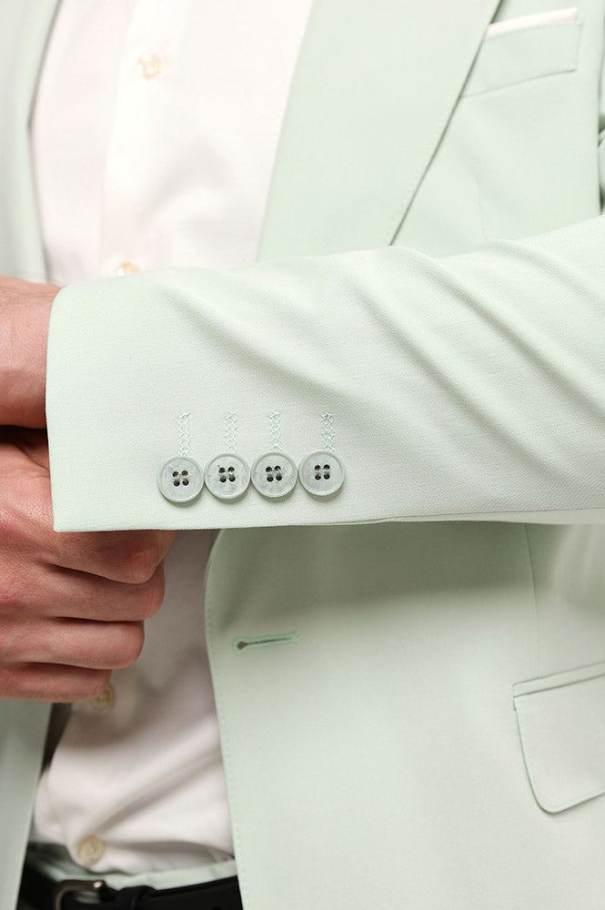 This suit set, made from a blend of 35% rayon and 65% polyester with a flat finish, includes a blazer and pants. The blazer has a notch lapel and side vents, fastened by double buttons. It features 2 flap pockets, 1 welt pocket, 1 inside pocket, and sleeve slits with 4 cuff buttons, and is fully lined. The pants have a zipper closure, 2 hip pockets, and 2 seam pockets. The suit can be machine or hand washed. Color or size customization is available and should be noted when placing an order, making it suitable for formal or semi-formal events.