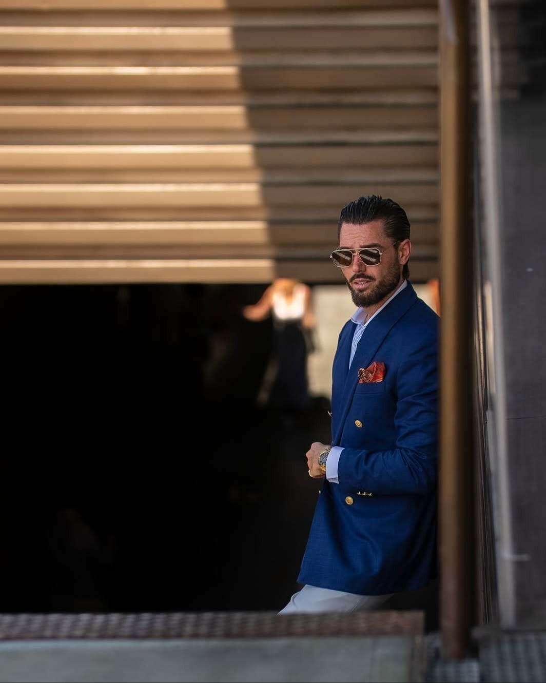 This men's suit is made of a blend of 35% rayon and 65% polyester, which is comfortable and durable, showing a simple yet elegant design. The suit jacket is designed as a classic double-breasted style with 4 exquisite buttons, showing a capable business style. The collar is designed as a peak collar, and the side slit details increase the overall dynamic and breathability. The jacket also has two flap pockets, a chest opening and an inner pocket, which is both practical and adds a sense of detail. The cuffs are designed with four3 piece buttons, highlighting the delicate craftsmanship.